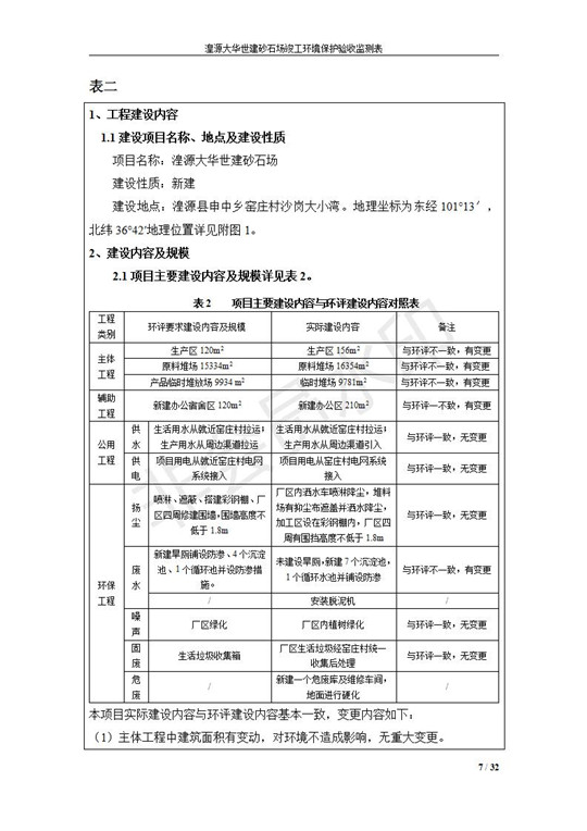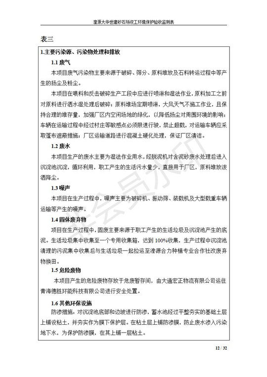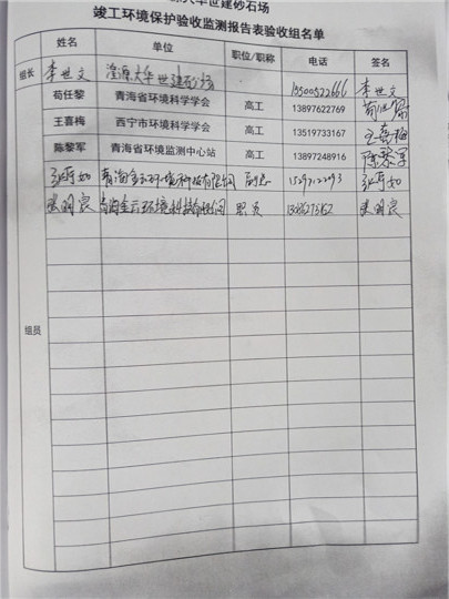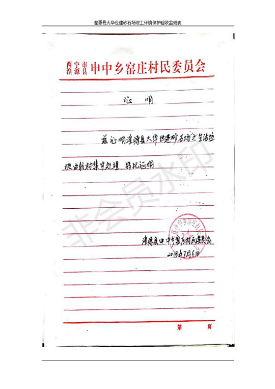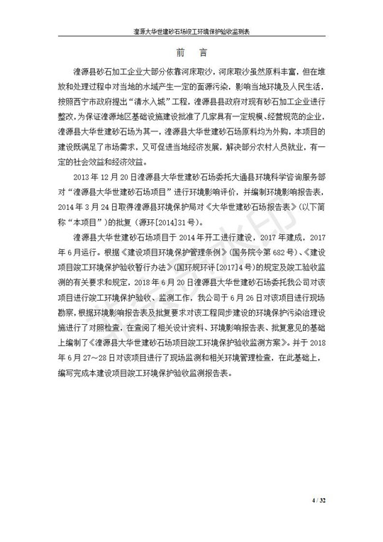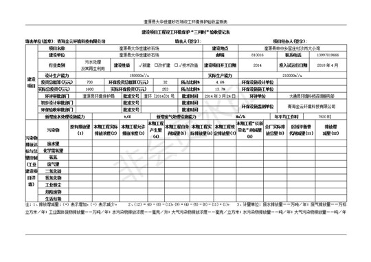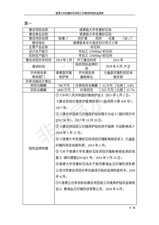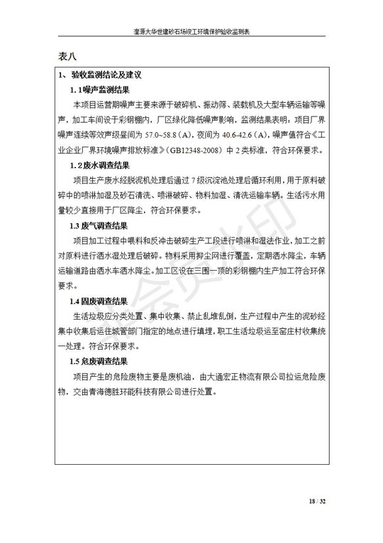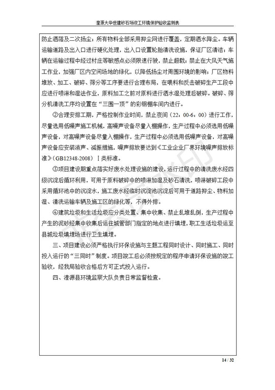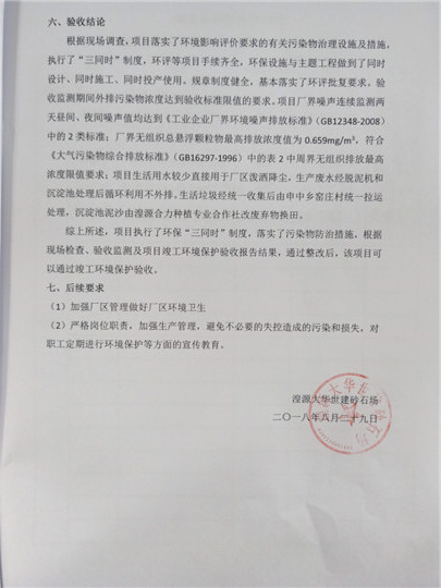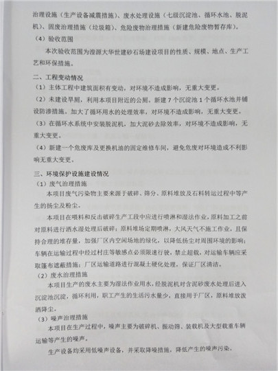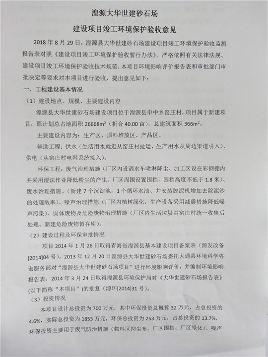 根據(jù)中華人民共和國國務(wù)院令第253號(hào)《建設(shè)項(xiàng)目環(huán)境保護(hù)管理?xiàng)l例》(中華人民共和國國務(wù)院令第682號(hào)《國務(wù)院關(guān)于修改〈建設(shè)項(xiàng)目環(huán)境保護(hù)管理?xiàng)l例〉的決定》和《建設(shè)項(xiàng)目竣工環(huán)境保護(hù)驗(yàn)收暫行辦法》,嚴(yán)格依照有關(guān)法律法規(guī),建設(shè)項(xiàng)目環(huán)境保護(hù)設(shè)施驗(yàn)收技術(shù)規(guī)范,本項(xiàng)目環(huán)評(píng)報(bào)告表和環(huán)保審批部門審批意見以及企業(yè)自行驗(yàn)收相關(guān)要求等對(duì)本項(xiàng)目進(jìn)行驗(yàn)收,本項(xiàng)目符合環(huán)保驗(yàn)收條件,可以通過環(huán)保驗(yàn)收。 湟源大華世建砂石場(chǎng)建設(shè)項(xiàng)目竣工環(huán)境保護(hù)驗(yàn)收意見.