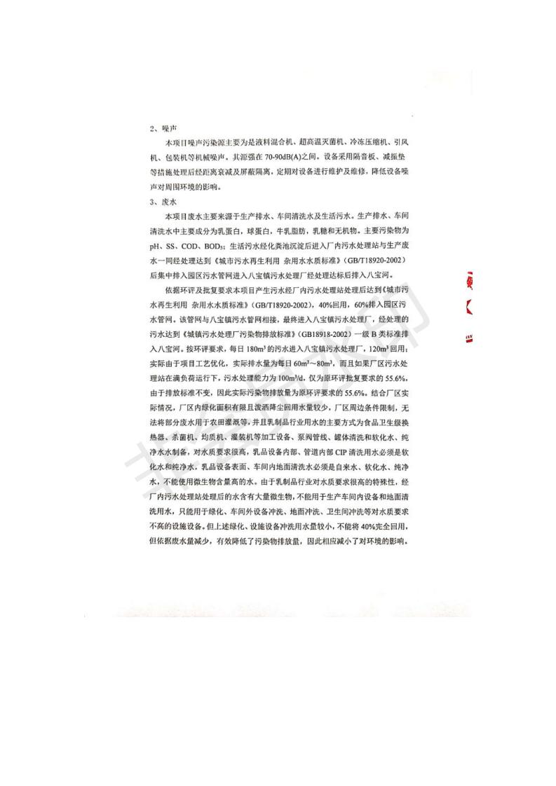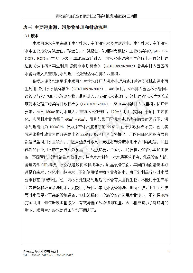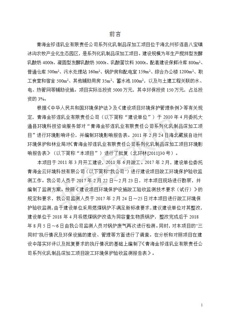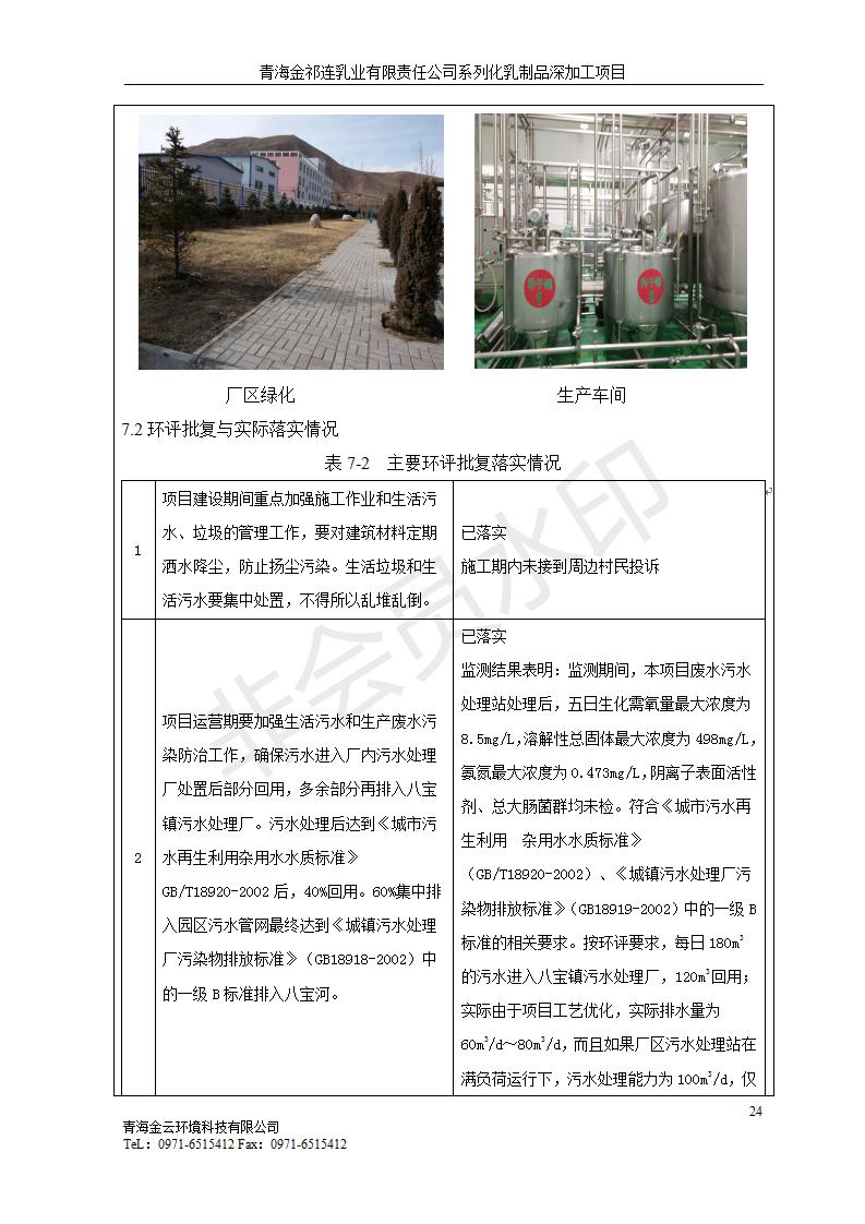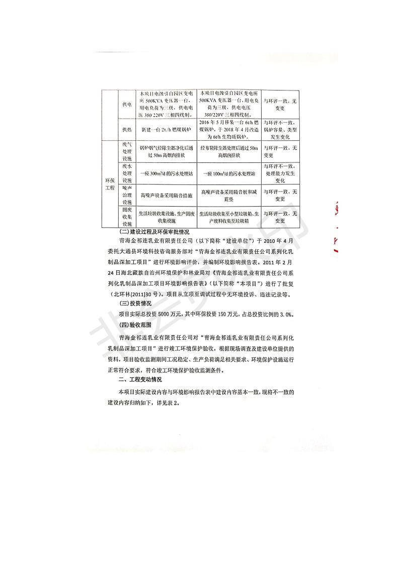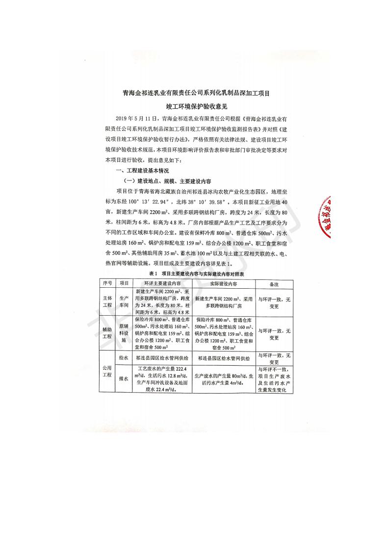 根據(jù)中華人民共和國國務(wù)院令第682號《國務(wù)院關(guān)于修改〈建設(shè)項目環(huán)境保護管理條例〉的決定》和《建設(shè)項目竣工環(huán)境保護驗收暫行辦法》(國務(wù)院令682號),青海金祁連乳業(yè)有限責(zé)任公司系列化乳制品深加工項目(包括竣工環(huán)境保護驗收監(jiān)測報告表和驗收意見)公示如下。 一、項目名稱:青海金祁連乳業(yè)有限責(zé)任公司系列化乳制品深加工項目 二、地點:海北藏族自治州祁連縣冰溝農(nóng)牧產(chǎn)業(yè)化生態(tài)園區(qū) 三、建設(shè)單位:青海金祁連乳業(yè)有限責(zé)任公司 四、建設(shè)內(nèi)容:本項目新征工業(yè)用地40畝,新建生產(chǎn)車間2200 m2、采用多聯(lián)跨鋼結(jié)構(gòu)廠房,跨度為24米,長度為80米,柱間距為6米,標(biāo)高為4.8米。廠房內(nèi)部根據(jù)產(chǎn)品生產(chǎn)工藝及工序要求分為不同的工作區(qū)域和車間辦公室。建設(shè)有保鮮冷庫800 m2、普通倉庫500m2、污水處理站房160 m2、鍋爐房和配電室159 m2、綜合辦公樓1200 m2、職工食堂和宿舍500 m2、其他輔助用房35 m2、蓄水池100 m2以及與土建工程相關(guān)聯(lián)的水、電、熱官網(wǎng)等輔助設(shè)施。 五、聯(lián)系人:張工 六、聯(lián)系電 話:0971-6515411 七、公示時間:二〇一九年七月十日至二〇一九年八月六日 公示期間,對上述公示內(nèi)容如有異議,請以書面形式反饋,個人須署真實姓名,單位須加蓋公章。