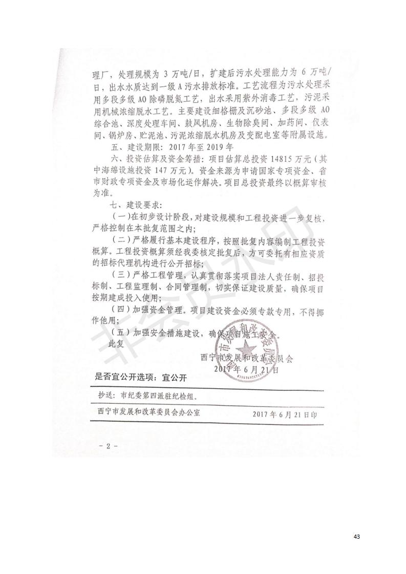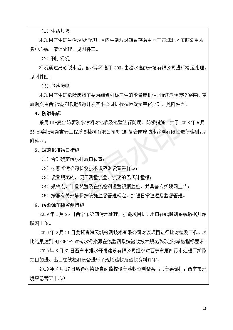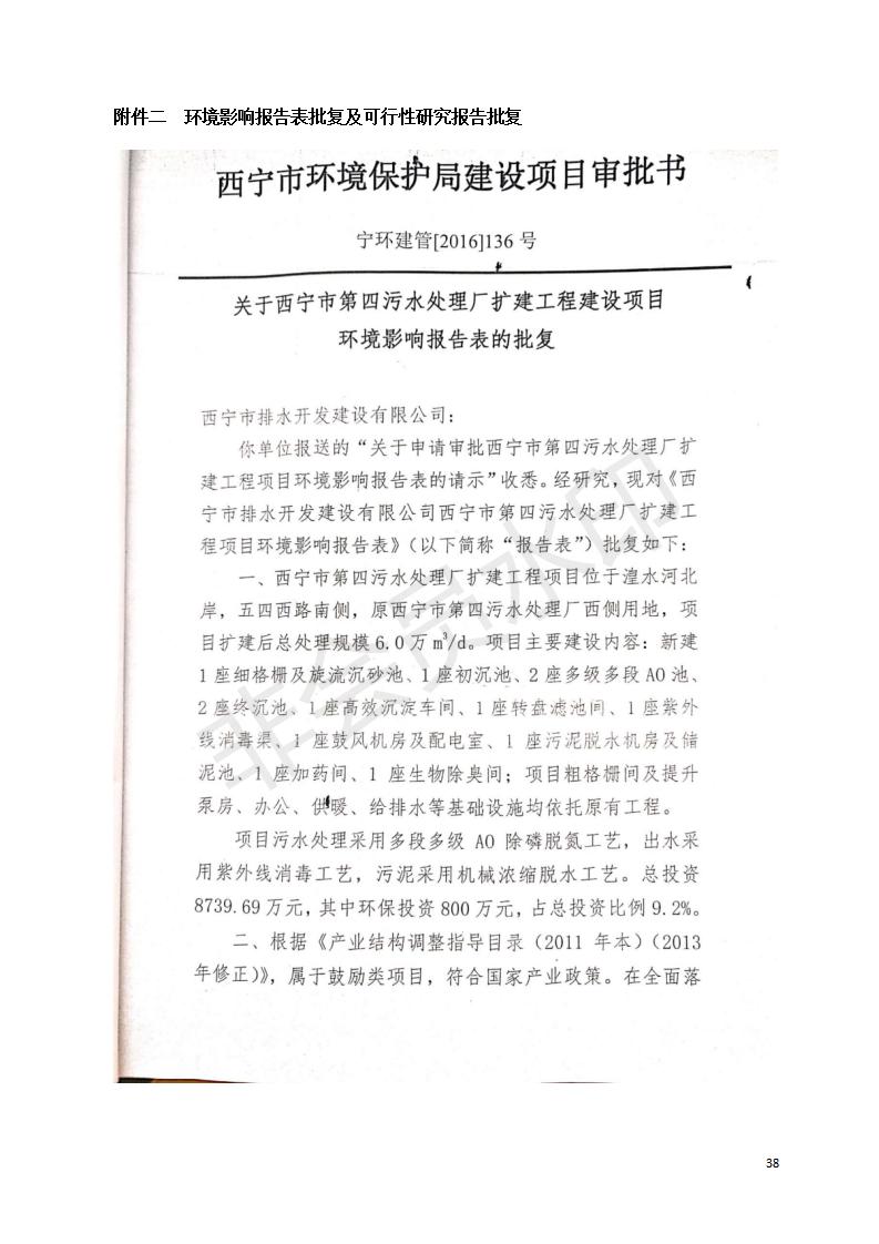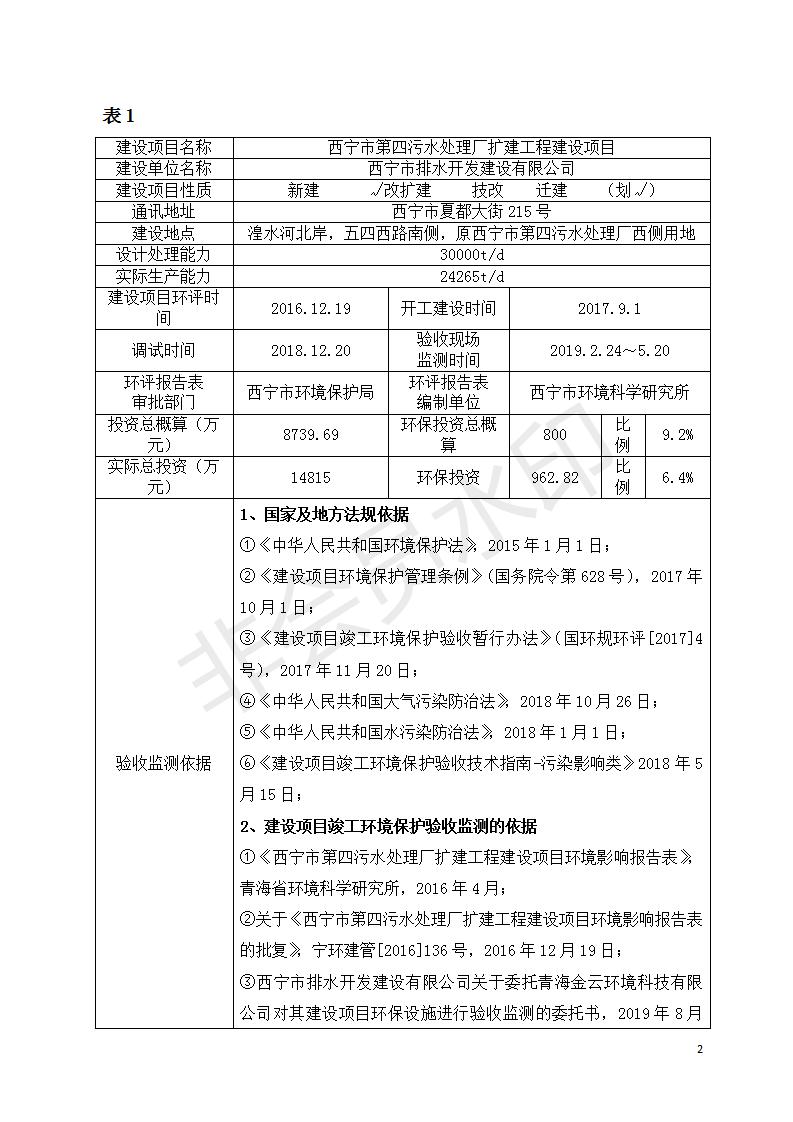 根據(jù)中華人民共和國(guó)國(guó)務(wù)院令第682號(hào)《國(guó)務(wù)院關(guān)于修改〈建設(shè)項(xiàng)目環(huán)境保護(hù)管理?xiàng)l例〉的決定》和《建設(shè)項(xiàng)目竣工環(huán)境保護(hù)驗(yàn)收暫行辦法》(國(guó)務(wù)院令682號(hào)),西寧市第四污水處理廠擴(kuò)建工程建設(shè)項(xiàng)目(包括竣工環(huán)境保護(hù)驗(yàn)收監(jiān)測(cè)報(bào)告表和驗(yàn)收意見(jiàn))公示如下。 一、項(xiàng)目名稱:西寧市第四污水處理廠擴(kuò)建工程建設(shè)項(xiàng)目 二、地點(diǎn):五四西路南側(cè),原西寧市第四污水處理廠西側(cè)用地 三、建設(shè)單位:西寧市排水開(kāi)發(fā)建設(shè)有限公司 四、建設(shè)內(nèi)容:第四污水處理廠擴(kuò)建工程五、聯(lián)系人:張工 六、聯(lián)系電 話:0971-6515411 七、公示時(shí)間:二〇一九年九月十七日至二〇一九年十月十八日公示期間,對(duì)上述公示內(nèi)容如有異議,請(qǐng)以書(shū)面形式反饋,個(gè)人須署真實(shí)姓名,單位須加蓋公章。