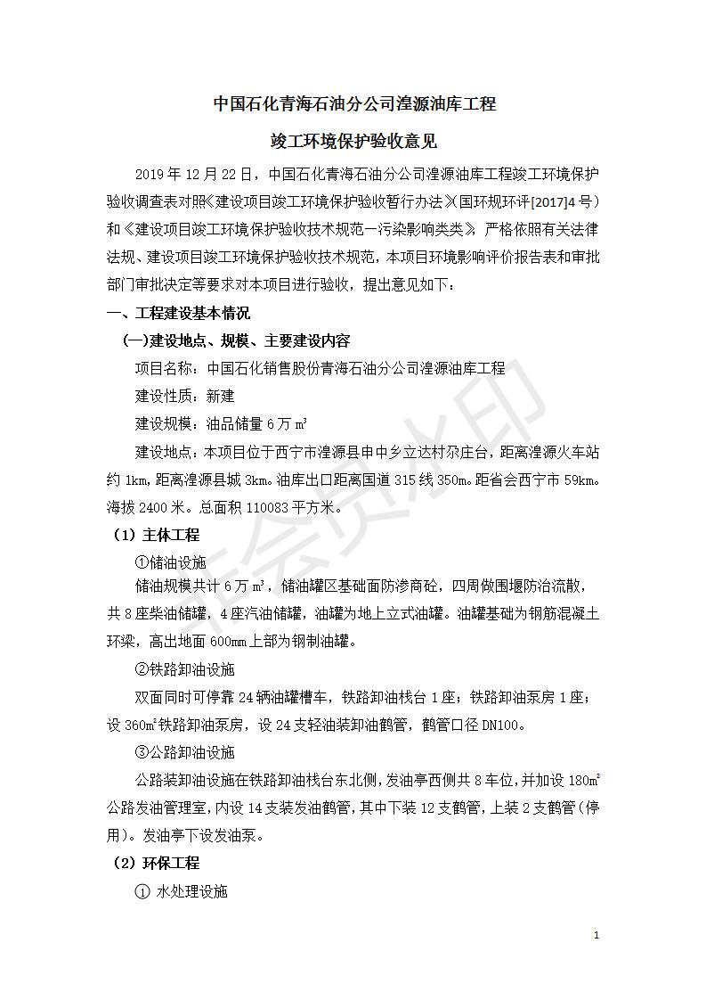 據(jù)中華人民共和國(guó)國(guó)務(wù)院令第682號(hào)《國(guó)務(wù)院關(guān)于修改〈建設(shè)項(xiàng)目環(huán)境保護(hù)管理?xiàng)l例〉的決定》和《建設(shè)項(xiàng)目竣工環(huán)境保護(hù)驗(yàn)收暫行辦法》(國(guó)務(wù)院令682號(hào)),中國(guó)石化青海石油分公司湟源油庫(kù)工程建設(shè)項(xiàng)目(包括竣工環(huán)境保護(hù)驗(yàn)收監(jiān)測(cè)報(bào)告表和驗(yàn)收意見(jiàn))公示如下。 一、項(xiàng)目名稱:中國(guó)石化青海石油分公司湟源油庫(kù)工程建設(shè)項(xiàng)目 二、地點(diǎn):西寧市湟源縣申中鄉(xiāng)立達(dá)村尕莊臺(tái) 三、建設(shè)單位:中國(guó)石化銷售股份有限公司青海石油分公司 四、建設(shè)內(nèi)容:油品儲(chǔ)量6萬(wàn)m3、其他配套設(shè)施。五、聯(lián)系人:董恒棟 六、聯(lián)系電話:18697130811 七、公示時(shí)間:二〇二〇年三月十三日至二〇二〇年四月十日 公示期間,對(duì)上述公示內(nèi)容如有異議,請(qǐng)以書面形式反饋,個(gè)人須署真實(shí)姓名,單位須加蓋公章。